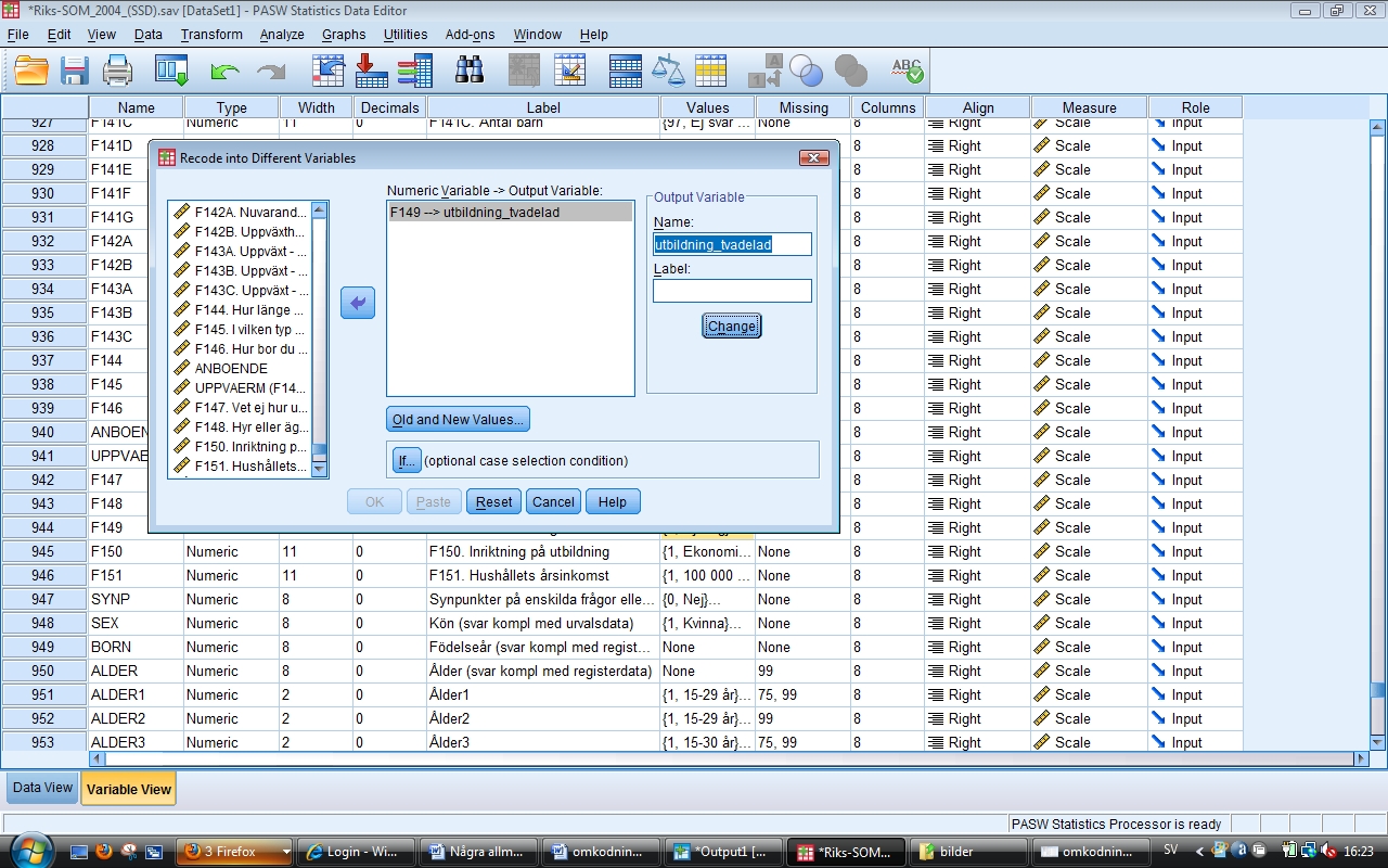 Ibland behöver man koda om variabler för att underlätta analyser. Om man till exempel jobbar med data från frågeundersökningar är man ibland inte intresserad av alla svarsalternativ på en viss fråga, utan  bara någon övergripande skillnad. Vi hämtar vårt exempel från SOM-undersökningen 2004, en frågeundersökning där en fråga ställs om den svarandes utbildning. Frågan har i frågeformuläret åtta svarsalternativ: