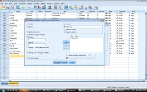 Steg 4. I den här ursprungsvariabeln finns det två koder för de som inte svarat på frågan, 98 och 99. Dessa vill vi naturligtvis inte ha med i vår analys. Därför klickar vi i området ”Old value” knappen ”All other values” och i området ”New value” trycker vi på knappen ”System-missing”. Därefter trycker vi på add. Det innebär att alla andra värden än de vi gett nya värden, alltså 1-8, nu kommer kodas om till ”Missing”. De kommer inte vara med i efterföljande analyser. Därefter trycker vi på ”Continue”, och kommer då tillbaks till den första dialogrutan. Där klickar vi på ”OK”, och SPSS gör nu våra analyser.