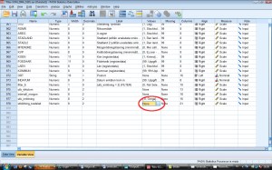 Steg 5. Gå nu in i ”Variable view” i SPSS, där alla variablerna i datamängden är uppradade. Längst ner borde nu den nya variabeln ligga. Vi ska nu ge ”Value labels”, etiketter, till datavärdena i den nya variabeln, så att vi i framtiden kommer ihåg att 0 står för ”Ej eftergymnasial utbildning” och 1 för ”Eftergymnasial utbildning”. På raden för den nya variabeln och i kolumnen ”Values” klickar vi där det nu står ”None”. Det dyker då upp en knapp med tre punkter. Klicka på den.