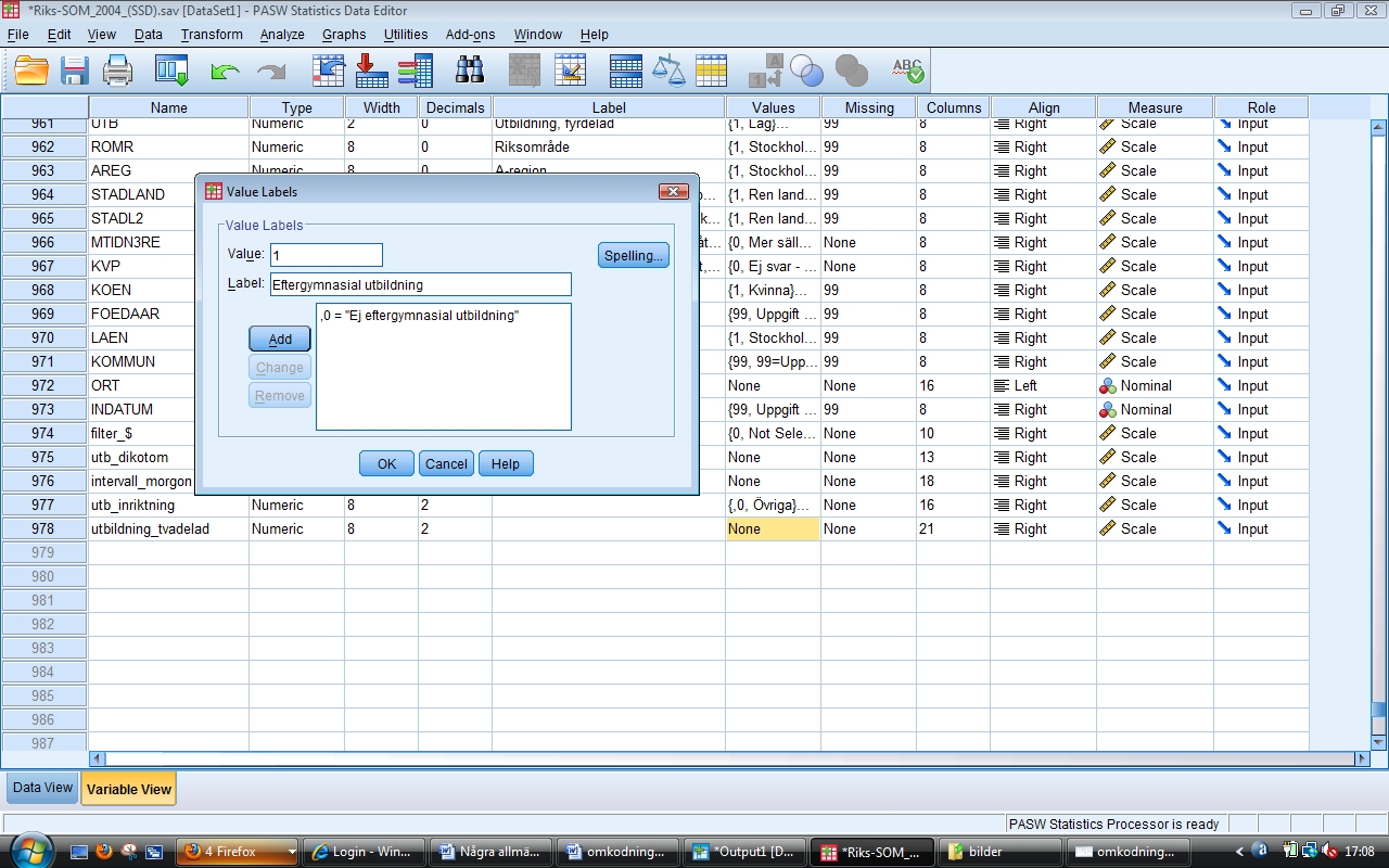 I rutan som kommer upp kan man skriva in etiketter för enskilda värden. I rutan ”Value” skriver vi först in 0, och i ”Label” skriver vi ”Ej eftergymnasial utbildning” och klickar på ”Add”. Därefter skriver vi i rutan ”Value” 1 och i rutan ”Label” ”Eftergymnasial utbildning” och klickar på ”Add”. Tryck sedan på ”OK”.