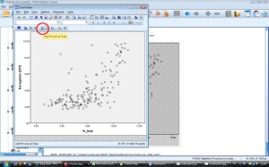 Steg 5. För att tydliggöra det samband vi tror oss se i scatterploten kan vi lägga in en regressionslinje. Regressionslinjen passas in för att minimera avståndet i Y-led till varje punkt (mer exakt: det kvadrerade avståndet). För att göra det, dubbelklicka på scatterploten i outputfönstret. Ett fönster som heter ”Chart editor” kommer då dyka upp.