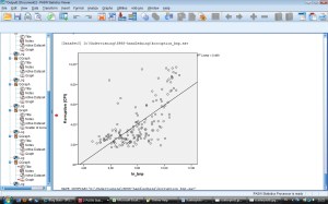 Ett fönster dyker upp med ”linear” ifyllt. Vi ska ha en linjär regressionslinje, ett rakt streck, så tryck bara på ”Close”. Kryssa ner chart editor. Scatterploten ska nu se ut ungefär som i bild 5. Linjen som pekar diagonalt uppåt visar på det positiva sambandet – höga värden på den ena variabeln hänger samman med höga värden på den andra variabeln. Linjer som pekar diagonalt neråt visar på negativa samband.