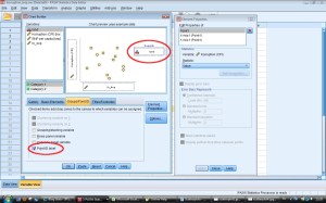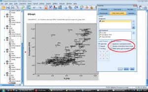 Steg 4. Man får nu upp en scatterplot som med många analysenheter blir väldigt rörig – namnen står en bit ifrån prickarna och linjer knyter ihop namn med punkt. Dubbelklicka på scatterploten för att öppna ”Chart editor”. I Chart editor, högerklicka på något av namnen och välj ”Properties window”. I rutan som kommer upp, välj ”Data value labels”.  Klicka ur rutan ”Suppress overlapping labels” och ”Display connecting lines to label” om de är ikryssade. Tryck på apply, och sedan close. Stäng därefter chart editor.