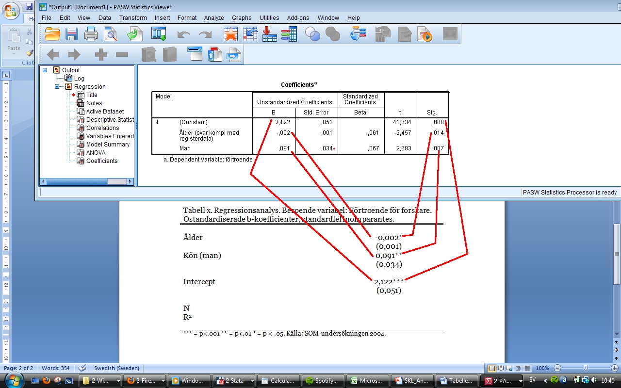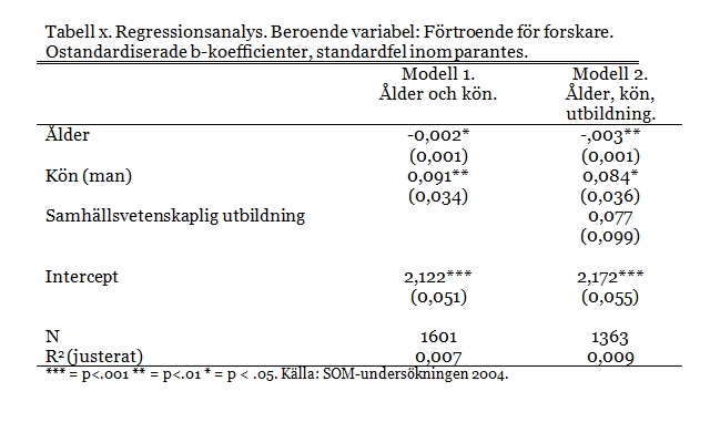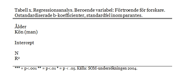 Steg 1. Gör tabellen. Data till det här exemplet hämtar vi från SOM-undersökningen 2004, där en fråga ställdes om hur stort förtroende respondenten har för forskare. Det blir vår beroende variabel. De oberoende variablerna är kön och ålder. Anledningen till att det står ”Kön(Man)” är att det är en dikotom variabel, där kvinna är kodat som 0 och man som 1. Eftersom regerssionskoefficienter visar vad ett steg uppåt på den oberoende variabeln har för effekt på den beroende variabeln, kommer den här koefficienten visa vad effekten är av att ”gå från man till kvinna”, alltså hur män skiljer sig från kvinnor. Därför skriver vi (man) inom parantes. Hade man vart kodat som 0 och kvinna som 1 hade vi skrivit ”Kön(Kvinna)”. Tabellen ska se ut som i Bild 1. I tabellerubriken står tabellens nummer (här symboliserat av X), vad det är för analysmetod, vad den beroende variabeln är, och vilka koefficienter det är vi redovisar (ostandardiserade). Varje oberoende variabel har en egen rad, liksom interceptet (även kallad konstanten). Vi ska också ange N-talet, antalet analysenheter, samt R2-värdet. I tabellkommentaren skriver vi en förklaring till de stjärnor vi ska använda för att ange signifikansnivån.