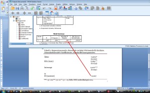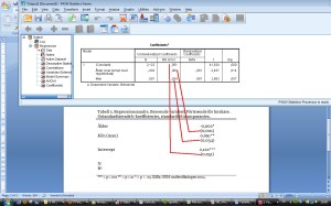Steg 2. Genomför regressionsanalysen. Vi ska nu hämta värden från SPSS-outputen och lägga in i tabellen. I Bild 2 visas varifrån vi hämtar koefficienterna – i kolumnen där det står ”Unstandardized coefficients” och ”B”. Vi skriver varje oberoende variabels koefficient på motsvarande rad i tabellen. Därefter anger vi om de är signifikanta med hjälp av stjärnor efter koefficient-talet. Signifikansen utläser vi från kolumnen ”Sig.” i SPSS-outputen. Ju lägre tal, desto bättre.