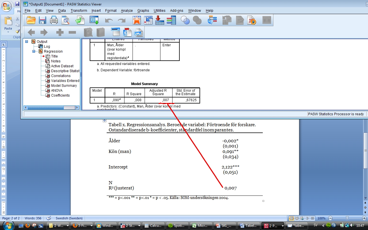 Steg 4. Ange R2-värdet. R2-värdet hittar man i SPSS-outputen i tabellen som heter ”Model Summary”. Man kan använda både R2-värdet, och det justerade R2-värdet. Det justerade värdet tar hänsyn till att R2 tenderar att stiga när man lägger in flera variabler i analysen, även om de inte har någon förklaringskraft, och justerar värdet nedåt. Det justerade värdet är alltså ett något försiktigare mått, som det inte skadar att använda. Skriv in det i tabellen som i Bild 4.