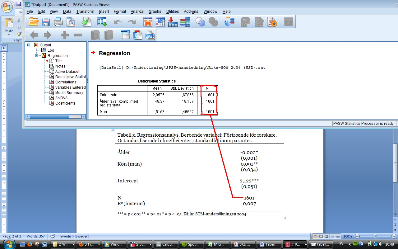 I outputen kommer nu två extra tabeller. Vi intresserar oss för den som heter ”Descriptive statistics”. I kolumnen ”N” står hur många analysenheter som ingick i analysen. Skriv in det på raden ”N” i tabellen, som i Bild 6. Tabellen är nu klar!