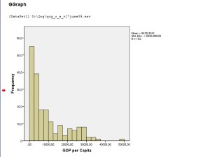 Ett annat exempel är BNP per capita i länder. Många länder har låg BNP per capita, halvmånga har mellanhög, medan några få länder har väldigt hög. Vi kan själva se detta genom att använda oss av QoG-datamängden, som finns att hämta hem från The Quality of Government Institute (här används Cross-sectionversionen). BNP-variabeln heter ”gle_gdp”. I bild 1 har ett histogram över variabeln tagits fram. Man får fram ett histogram genom att gå in på ”Graphs–>Chart builder–>Bar–>Simple bar” och dra in sin variabel på X-axeln. En högre stapel visar att det finns många länder i det spannet.