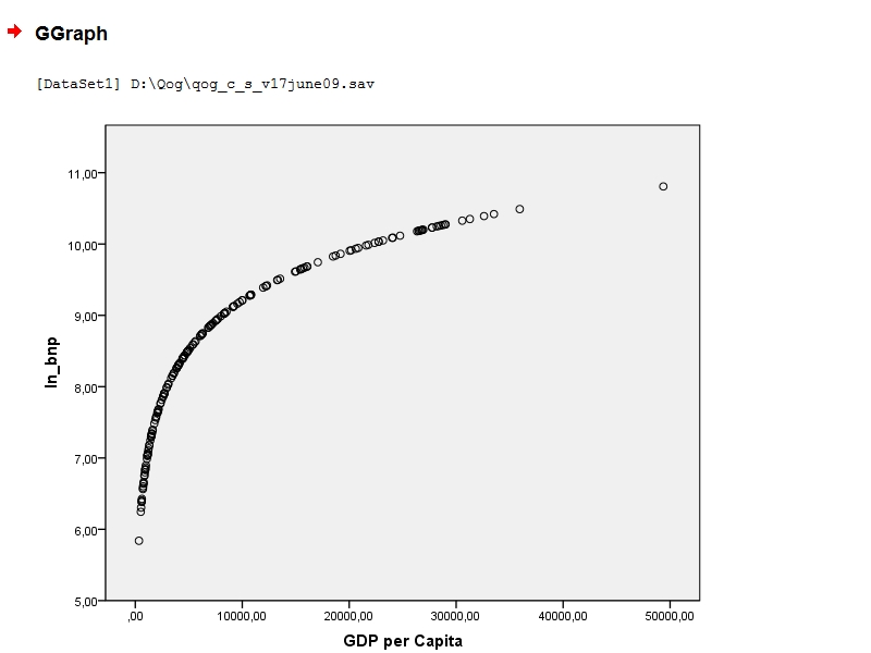 Detta är inte fusk! Vi har inte ändrat på variabeln i egentlig mening. Men vi har ändrat den teoretiska betydelsen av variabeln – om vi nu använder den som oberoende variabel i en regression så letar vi inte efter ett linjärt samband, utan ett ickelinjärt. Vi tror att det finns en avtagande effekt av BNP – ökningar av BNP från en låg nivå betyder mer än ökningar av BNP från en hög nivå.