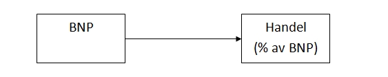 Vi vill undersöka om ett lands nivå av BNP påverkar hur stor andel av landets BNP som utgörs av handel med andra länder. Vi tror att länder med högre BNP också har mer handel (som andel av BNP) än andra länder. Vårt första samband är alltså illustrerat i bild 1: