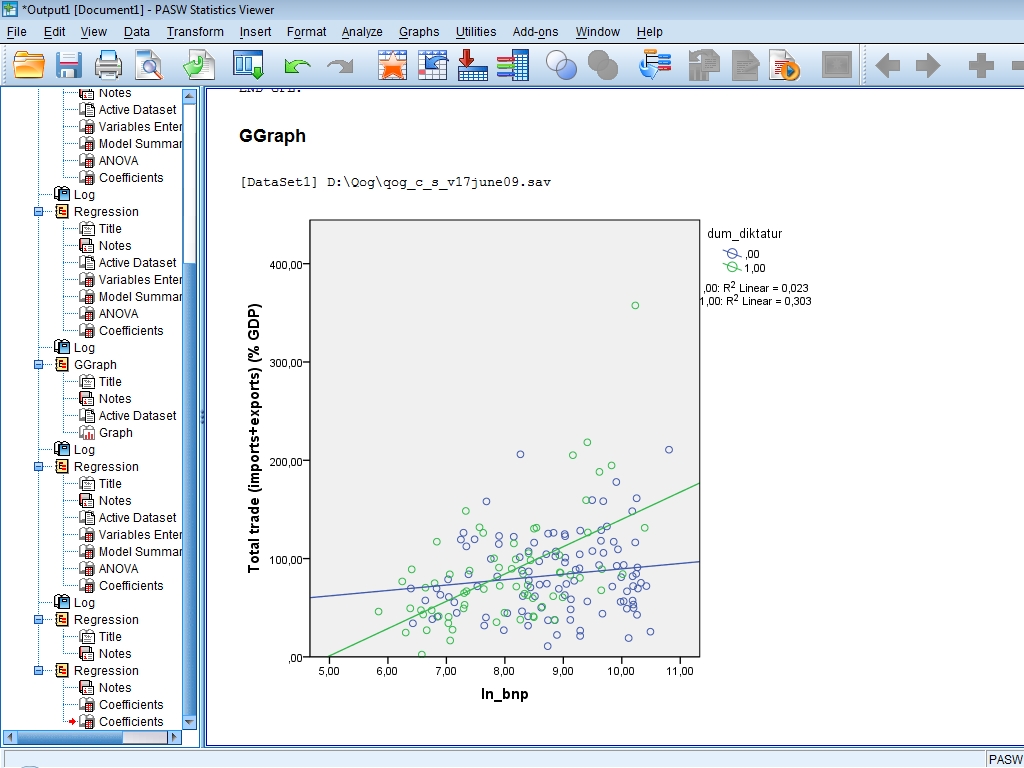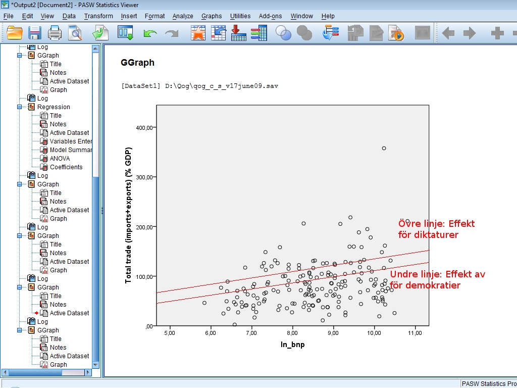 Vi ser att BNP fortfarande har en positiv effekt, även under kontroll för typ av politiskt system (0 = Demokrati, 1=Diktatur). Vi ser också att i diktaturer utgör handeln en större andel av BNP, även om effekten bara är signifikant med 90 procents säkerhet. Det går inte att rita ut det här i en scatterplot automatiskt, men jag ska ändå visa hur vi ska tolka det här genom att rita ut regressionslinjerna i en scatterplot – se bild 6.