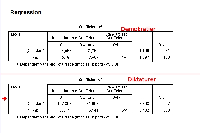 Kontentan är att vi kan tolka koefficienten av ln_bnp (5,497) som effekten av ln_bnp för demokratier. Effekten av ln_bnp för diktaturer är istället koefficienten för ln_bnp PLUS effekten av inter_lnbnp_x_diktatur, alltså 27,772! Alla demokratier kommer ha 0 i värde på interaktionstermen, och får därför inget extra tillskott därifrån, vilket diktaturer får. Effekten av BNP på handel är alltså ungefär 5 gånger så stor i diktaturer som i demokratier. Faktum är att effekten av BNP i demokratier inte ens är signifikant: signifikansen är bara ,145, och vi vill att den ska vara under ,050.