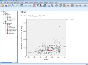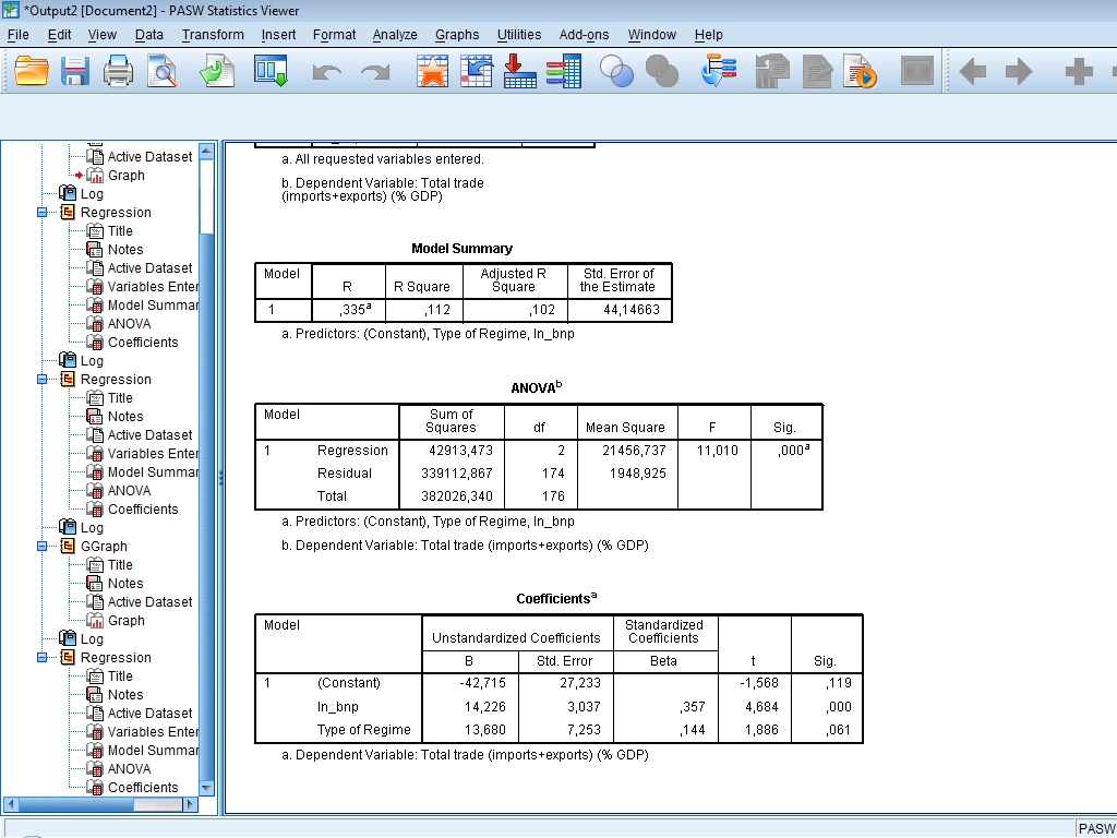 Först kan vi göra en bivariat regression för att se om logaritmerad BNP har någon effekt på handel. Vi får då ut en tabell som ser ut som i bild 3. Vi ser där vid punkt 1 att det finns en signifikant positiv effekt av logaritmerad BNP på handel. Hur stor är effekten? Jo, om den oberoende variabeln ökar med ett steg ökar handeln som procent av BNP med 12,241 procent (punkt 2). Den oberoende variabeln förklarar 8,9 procent av variansen i den beroende variabeln, vilket vi ser vid punkt 3.