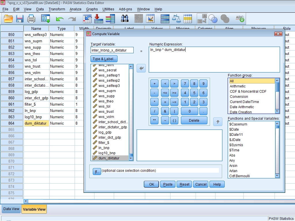 För att åstadkomma detta behöver vi skapa en interaktionsterm. Vi går då in på ”Transform–>Compute variable”. Vi skriver in namnet på den nya variabeln, som är inter_lnbnp_x_diktatur. Det visar att det är en interaktionsterm, och sen är det namnet på de två variablerna som ingår i interaktionen, med en multiplikationssymbol mellan dem. Multiplikationssymbolen är med för att det är så vi skapar interaktionstermen – vi multiplicerar de båda variablerna med varandra. I rutan ”numeric expression” klickar vi in de två variablerna ln_bnp och dum_diktatur, och skriver ett multiplikationstecken emellan. Det ska se ut som i bild 7. Klicka därefter på OK.