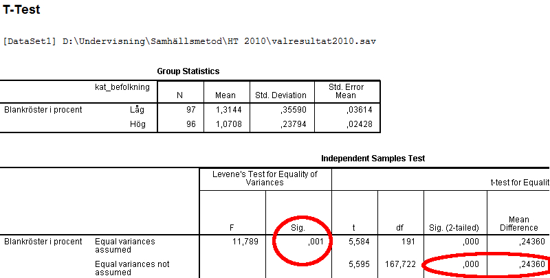 I det här fallet blir Levene’s test signifikant, och vi får därför titta i raden ”Equal variances not assumed”. Vi går sedan till kolumnen ”Sig. (2-tailed)” som testar om medelvärdesskillnaden som beskrivs i kolumnen ”Mean difference” är signifikant. Om värdet är under ,050 är skillnaden signifikant med 95 procents säkerhet. Det vill säga, skillnaden vi hittat i vårt slumpmässiga urval återfinns med 95 procents säkerhet också i den större populationen. Så är fallet nu, vilket innebär att skillnaden i andelen blankröster i små och stora kommuner är signifikant.
