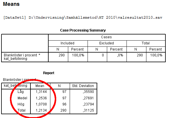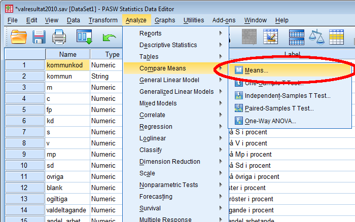 Sambandet vi ska undersöka är huruvida det finns ett samband mellan en kommuns befolkningsstorlek och andelen blankröster i kommunen. Det vi gör då är att gå in på ”Analyze–>Compare Means–>Means”.