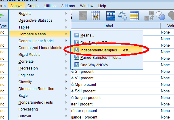 Vi går då in på ”Analyze–>Compare Means–>Independent samples t-test”.