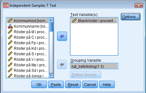 T-testet är till för att testa om skillnaden mellan två grupper är signifikant, så efter att man klickat i den oberoende variabeln ska man trycka på knappen ”Define groups”. I rutan som kommer upp skriver man i namnet på de två grupper man vill jämföra. Vill här jämföra ytterpunkterna på skalan – finns det en signifikant skillnad mellan kommuner med ”Låg” befolkning (värde 1) och ”Hög” befolkning (värde 3)? När man valt grupp 1 och 3 trycker man på OK. Outputen visas i bild 6.