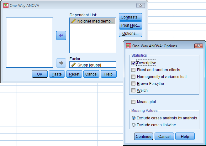 För att genomföra variansanalysen går man in på ”Analyze->Compare Means->One-way ANOVA”. I rutan som dyker upp klickar man i den beroende variabeln, nöjdhet med demokratin, i rutan ”Dependent list”. Den oberoende variabeln grupp klickar man in i rutan ”Factor”. Tryck också på knappen ”Options” och klicka i ”Descriptives”, som i bild 1. Tryck sedan på ”Continue” och ”Ok”.