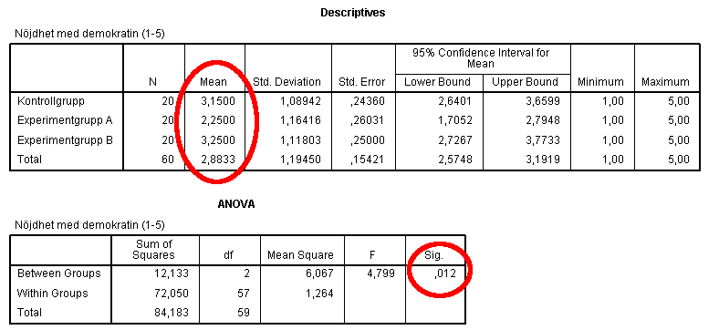 Slutsatsen av variansanalysen blir alltså att Experimentgrupp A är signifikant mindre nöjda med demokratin än både kontrollgruppen och Experimentgrupp B, medan kontrollgruppen och Experimentgrupp B inte är signifikant skilda ifrån varandra. Hade det vart ett riktigt experiment hade man kanske kunnat dra slutsatsen att negativ information påverkar nöjdheten med demokratin mer än vad positiv information gör.