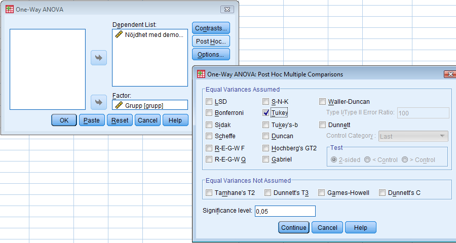 För att genomföra post hoc-testet går vi återigen in på ”Analyze->Compare Means->One-way ANOVA”. Vi låter allting stå kvar som förut, fast klickar nu på knappen ”Post hoc” och klickar i rutan ”Tukey”, som i bild 3. Tukey är ett ofta använt test, men det finns som synes också många andra test, som alla innebär lite olika antaganden.