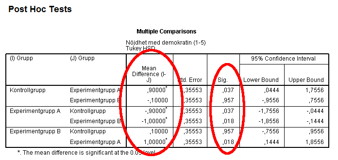I den första raden i bild 4 jämförs kontrollgruppen med först Experimentgrupp A och sedan Experimentgrupp B. I den första inringningen, kolumnen ”Mean Difference”, kan vi se medelvärdesskillnaderna som fåtts fram genom att ta medelvärdet för kontrollgruppen minus medelvärdet för Experimentgrupp A. Det blir alltså 3,15-2,25=0,9. Är skillnaden signifikant? För att ta reda på det går vi till kolumnen Sig. Värdet är ,037, vilket är under ,050. Alltså är skillnaden signifikant med 95 procents säkerhet. Det kan vi också se genom att SPSS automatiskt satt ut en liten stjärna vid medelvärdesskillnaden.
