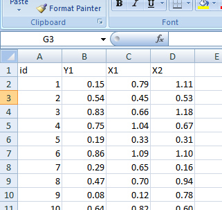 Datamängden ska vara organiserat på samma sätt som i SPSS, det vill säga att varje rad representerar en analysenhet, och varje kolumn en variabel. I det här exemplet kommer jag att använda mig av en konstruerad datamängd, som innehåller data för 50 personer på tre variabler: den beroende variabeln Y1, och de oberoende variablerna X1 och X2. För den som vill följa med i exemplet kan man ladda ner datamängden härifrån.