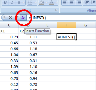 När man utökar ytan som formeln täcker ska man istället för att göra en två kolumner bred och fem rader hög markering göra en markering som är tre kolumner bred och fem rader hög. Koefficienterna presenteras i omvänd ordning, så att variabel X2 står i kolumnen längst till vänster, X1 i mitten och interceptet längst till höger, som i bild 5.