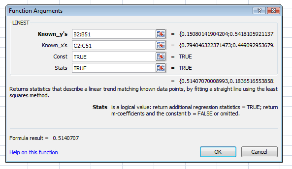 I rutan ”known x’s” skriver man in motsvarande område för den oberoende variabeln, i det här fallet C2:C51. I rutan ”Const” ska man skriva TRUE och i rutan Stats ska man också skriva True. Det gör vi för att vi först av allt vill att det ska finnas med en konstant (ett intercept) i regressionen, samt att vi vill ha ut lite extra statistiska uppgifter. Tryck sedan OK.