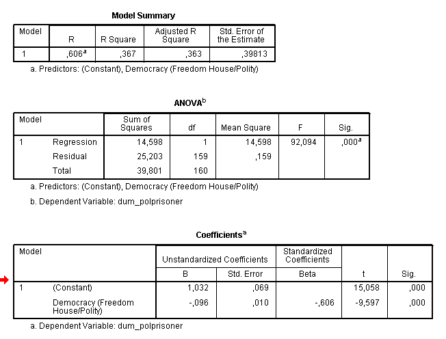 Koefficienten för den oberoende variabeln är negativ och statistiskt signifikant, vilket innebär att ju mer demokratiskt ett land blir, desto lägre värde förväntas man ha på den beroende variabeln. R2-värdet är 0,37, vilket tyder på att 37 procent av variationen i den beroende variabeln förklaras av den oberoende variabeln. Men går det att förstå resultaten på ett meningsfullt sätt? Interceptet (constant) visar vad det förväntade värdet på den beroende variabeln är när den oberoende variabeln är 0. I det här fallet är interceptet 1,032. Det innebär alltså att vi förväntar oss att de minst demokratiska länderna har värdet 1,032 på en variabel som maximalt kan ha värdet 1, vilket känns lite märkligt.