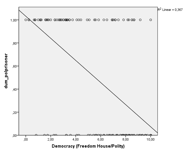 I det här exemplet vill jag undersöka sannolikheten att ett land tar politiska fångar, ett aktuellt ämne efter Arabvåren. Påverkas denna sannolikhet av graden av demokrati i landet?