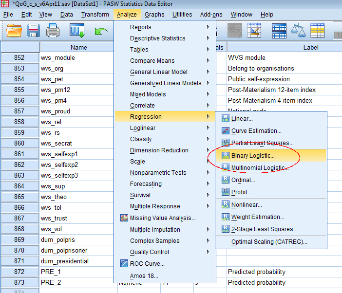 Att genomföra regressionen är busenkelt. Man går bara in på ”Analyze->Regression->Binary Logistic”, som visas i Bild 3.