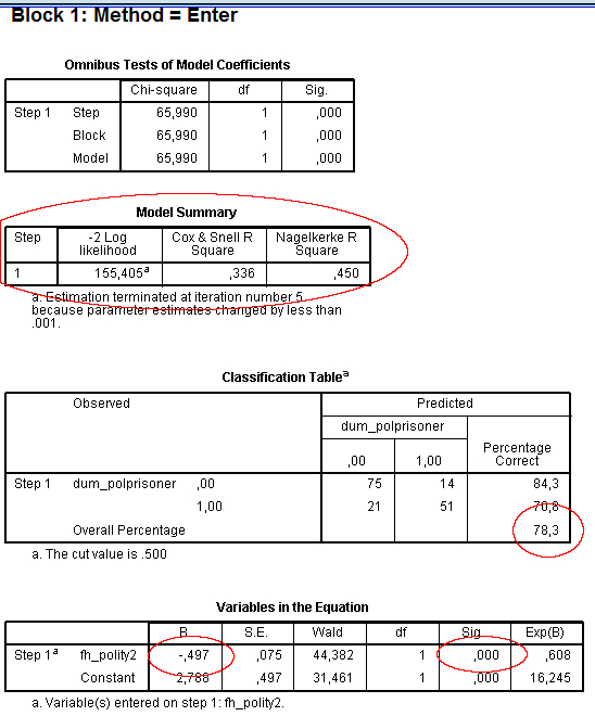 En mer lättfattlig indikation på hur bra modellen är på att predicera den beroende variabeln får vi i nästa tabell, ”Classification Table”. Här kan vi se vad vår modell gissade att varje analysenhet skulle ha för värde, och vad den faktiskt hade för värde. I det här fallet kan vi se att av de 89 länder där man inte tar politiska fångar gissade vår modell rätt på 75 länder, och fel på 14. Bland de 72 länder som faktiskt tar politiska fångar så gissade vi rätt i 51 fall, och fel i 21 fall. Längst ner till höger kan vi se den totala andelen rätt gissningar: 78,3%, vilket i jag tycker är ganska bra.