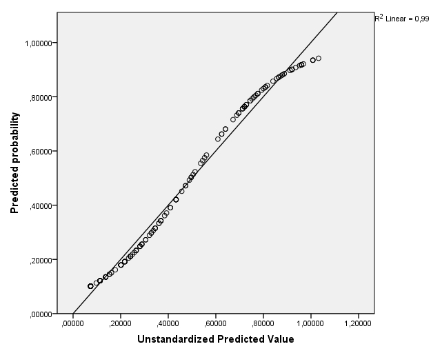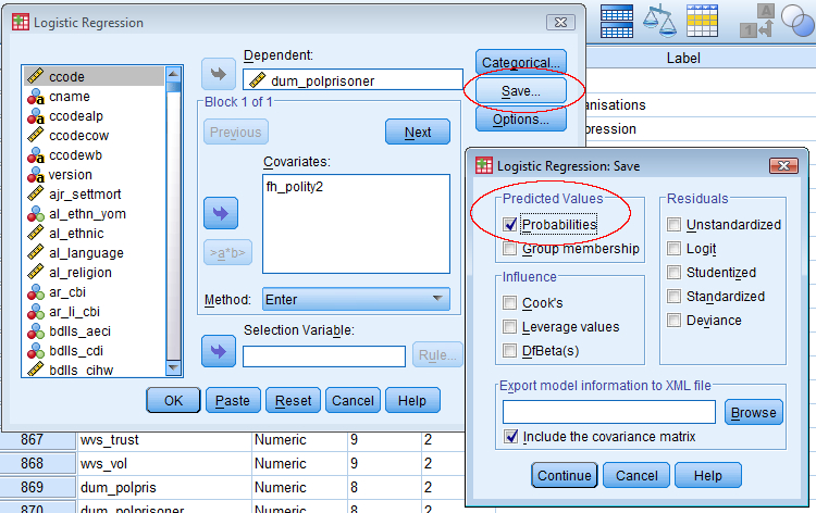 Först gör vi om analysen, men när vi klickat i beroende och oberoende variabel klickar vi på knappen ”Save”. Där klickar vi i rutan ”Probabilities” under rubriken ”Predicted values”. Tryck sedan på ”Continue” och ”OK”. Vi har nu sagt till SPSS att vi vill ha ut varje analysenhets förväntade sannolikhet att ha värdet 1 på den beroende variabeln, givet vad analysenheten har för värde på den oberoende variabeln. Länder som är mer demokratiska ska alltså ha en lägre sannolikhet.