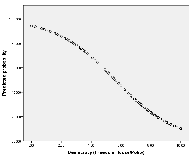Den oberoende variabeln är ett index som väger samman två demokratimått, ett från Freedom House och ett från projektet Polity. Variabeln har värden från 0 till 10, där 0 betyder minst demokratiskt och 10 betyder mest demokratiskt.
