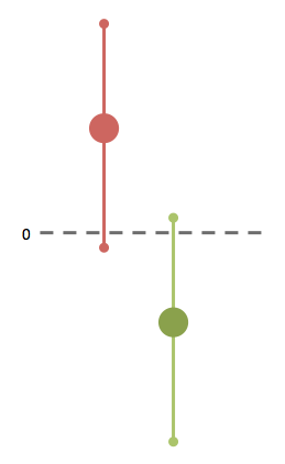 A: Mätningar av två saker kan ha överlappande konfidensintervall och ändå vara signifikant skilda. Tänk dig att det bara är ändarna som överlappar, som på bilden. Vi kan inte med 95% säkerhet säga att det röda värdet inte är är noll, och vi kan inte heller vara 95% säkra på att det gröna värdet inte är noll.