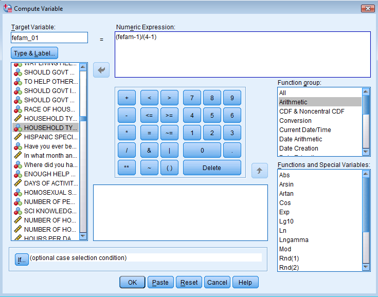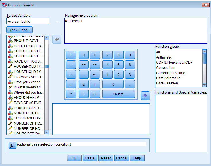 Ett snajdigt sätt att skapa indexen är att istället välja Function Group = Statistical samt Functions and Special Variables = Mean i COMPUTE-rutan. Då blir indexet medeltalet av alla variabler som ingår och som inte har bortfall (dvs det uppstår inget bortfall så länge det finns någon enda ingående variabel som har godkända värden).