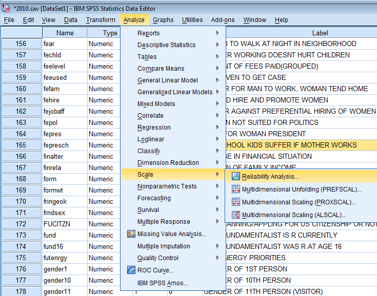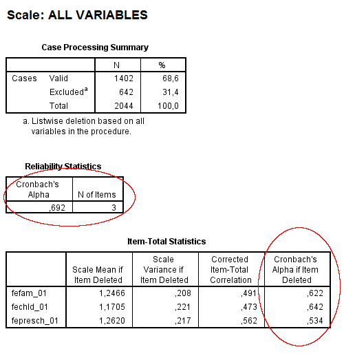 Antalet som svarat på frågan är 2923 respektive 2584, när jag ska testa reliabiliteten med hjälp av Cronbach’s Alpha får jag dock felmeddelandet: ”there are too few cases (n = 0) for the analysis. execution of this command stops”.