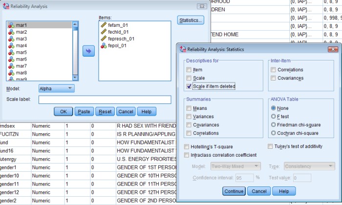 När man får upp rutan klickar man i de variabler man vill testa i rutan ”Items”. Därefter klickar man på knappen ”Statistics” och klickar i knappen ”Scale if item deleted”. Tryck därefter på ”Continue” och ”OK”.