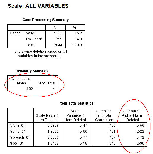 Man får då ut output som ser ut som i Bild 5. Det intressantaste är rutan ”Reliability statistics”. Där står det i kolumnen ”Cronbach’s Alpha” ett värde som kan variera mellan 0 och 1, där högre värden betyder högre reliabilitet. I det här fallet blir värdet ,602. Den vanliga tumregeln för när man ska tycka att index är tillräckligt bra brukar sägas vara ,700. Vårt index är alltså inte riktigt okej. Vi kan då gå till rutan ”Item-total statistics” och titta i kolumnen ”Cronbach’s alpha if item deleted”. Där visar SPSS vad vi skulle få för värde på Cronbach’s alpha ifall vi tog bort en enskild variabel. Vi ser då att Cronbach’s alpha skulle sjunka ifall vi tog bort någon av frågorna ”fechld”, ”fefam” eller ”fepresch”, det vill säga frågorna som har att göra med mödrar och arbete. Däremot ser vi att Cronbach’s alpha skulle öka till ,690 ifall vi tog bort frågan som handlar om kvinnor i politiken.