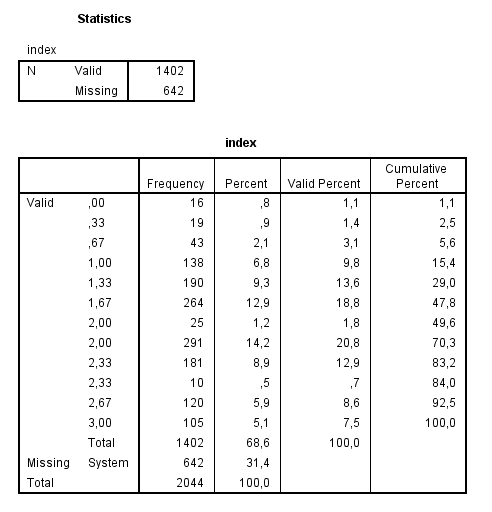 Jag funderar på detta med att jag alltid tidigare har sett att index har värden från 0 till 100, och jag har nåt ställe ett notat som berättar mig formuläret matematiskt (men ej om hur jag ska gå fram i SPSS, men det hittar jag säkert fram till).