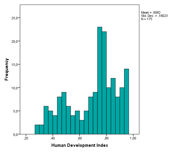 I korrelationsmatrisen ser vi också att det kan vara lämpligt att gå vidare med en regression med kontrollvariabler eftersom både avsaknad av korruption (oberoende variabel) och mänsklig utveckling (beroende variabel) är positivt korrelerade med andra oberoende variabler. Det kan ge upphov till skensamband, det vill säga att det verkar som att beroende och oberoende variabler hänger ihop, när de i själva verket båda är orsakade av någon annan variabel (till exempel demokrati).