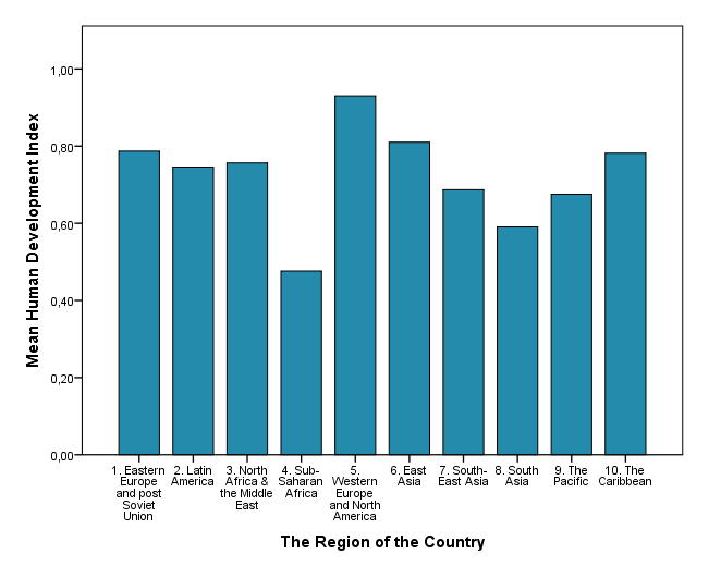 För den här frågeställningen är det lämpligare att presentera huvudsambandet med en scatterplot, men när man har en frågeställning där den oberoende variabeln är olika kategorier (en nominalskala), som man sedan tänker undersöka med hjälp av regressionsanalys med dummyvariabler, kan det i del 2 vara lämplig att visa sambandet med ett stapeldiagram. För demonstrationens skull visar jag därför den genomsnittliga nivån av mänsklig utveckling i olika regioner i världen (ht_region i QoG-datamängden).