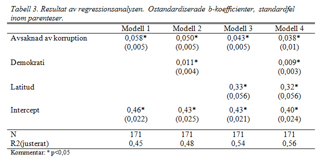 Det som vanligen är av intresse i en tabell av den här typen är hur effekten av den oberoende variabeln som är i fokus förändras när man lägger till olika kontrollvariabler. Vi ser i tabellen att effekten av avsaknad av korruption minskar när vi kontrollerar för demokrati och latitud, vilket innebär att en del av sambandet mellan avsaknad av korruption och mänsklig utveckling beror på att länder som inte är korrupta också är mer demokratiska och är belägna längre norrut. I den sista modellen kvarstår emellertid en tydlig effekt av avsaknad av korruption.