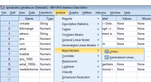 Analyskommandot hittar vi under ”Analyze->Mixed models->Linear”, som i Bild 1.