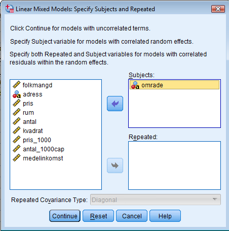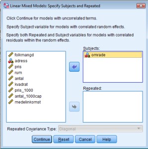 I den första dialogrutan man får upp ska man ange vilken variabel som visar vilken nivå 2-enhet varje analysenhet tillhör. I det här exemplet så har vi lägenheter grupperade inom stadsdelar i Göteborg, så vi klickar in variabeln ”omrade” i rutan ”Subjects”. ”Repeated” bryr vi oss inte om. Tryck sedan på continue.