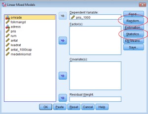 I nästa ruta ska man ange beroende och oberoende variabler. Vi skulle börja med att göra en tom modell, så vi ska bara ange den beroende variabeln, ”pris_1000”, pris i 1000-tals kronor. Anledningen till att vi använder pris i 1000-tals kronor istället för den vanliga variabeln är att det nu blir mer lätthanterliga koefficienter. Den beroende variabeln klickar man in i rutan ”Dependent variable”. Vi behöver nu ställa in lite alternativ genom att klicka på knapparna ”Random” och ”Statistics”.