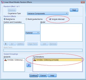 Vi behöver göra två saker. Först ska man klicka i rutan ”Include intercept” för att visa att vi vill att interceptet ska kunna variera. Därefter ska man flytta över variabeln ”omrade” till rutan ”Combinations”, för att visa att det är mellan stadsdelarna i Göteborg som vi vill att interceptet ska kunna variera. Klicka sedan på continue.