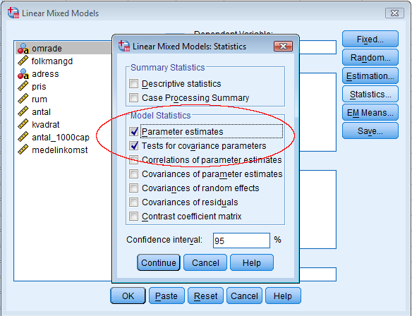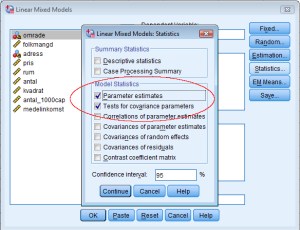 Därefter ska man klicka på knappen ”Statistics”. Här väljer vi vilken information vi vill få ut från analysen. Klicka här i ”Parameter estimates” och ”Test for covariance parameters”. ”Parameter estimates” visar att vi vill få ut effekterna av de oberoende variablerna, och ”Test fo covariance parameters” visar att vi vill få ut uppskattningar av hur mycket de olika sakerna varierar (Interceptet i det här fallet). Klicka sedan på continue och OK.
