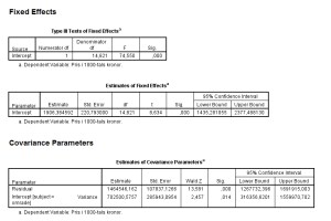 Output för Covariancen är enkel och klar som korvspad, men output för fixed effects är svårtolkad tycker jag….